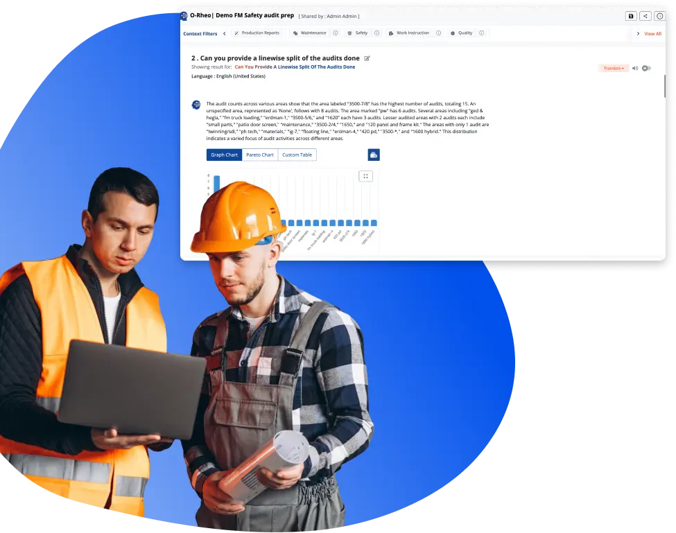Talk to O-Rheo, our AI oracle and get instant summaries of audits supported with picture and video evidence. Generate graphs automatically from audit data.