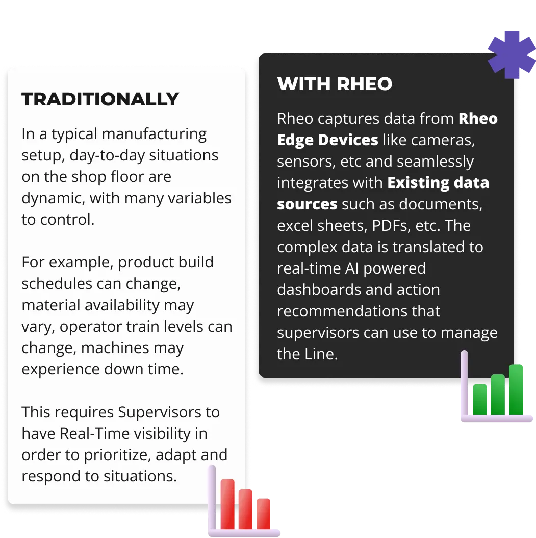 Rheo captures data from Rheo Edge Devices like cameras, sensors, etc and seamlessly integrates with Existing data sources such as documents, excel sheets, PDFs, etc. The complex data is translated to real-time AI powered dashboards and action recommendations that supervisors can use to manage the Line.